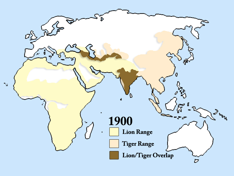 While that is true today, it does not reflect the majority of lion and tiger history. Currently ligers cannot exist in the wild because lion and tiger territories no longer overlap. This is a recent change of events and is a direct result of the exponential growth of the human population, the loss of viable wild habitats, and the extermination of lion and tiger populations (particularly in the past 100 years).